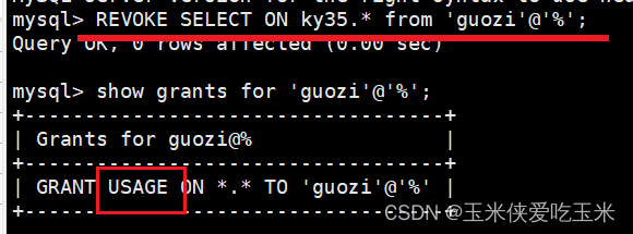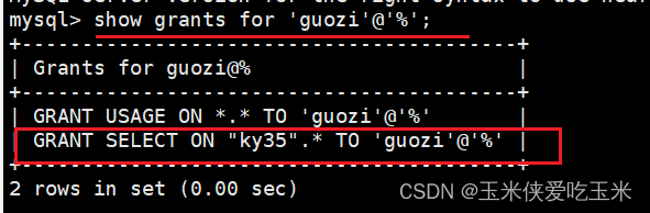 授权 guozi 看的权限 ky35库下所有表 登录来源只能为任意网段