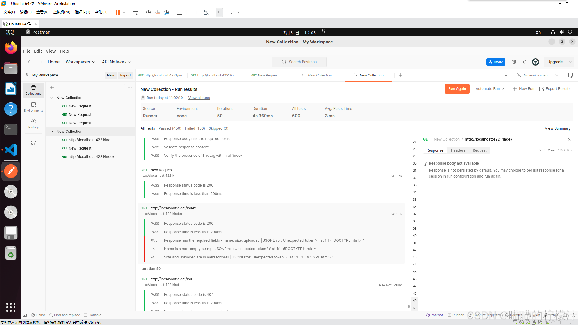 在随后修改了部分代码逻辑(主要是锁的相关逻辑),并通过postman进行相关的测试,在测试的过程中发现有一个问题,在压力测试或者在超过2个的并发测试过程中,最后一个请求软件显示为running request,软件上得不到其他信息,但是软件退出重进后,软件的记录又显示收到了相关的请求信息,不太清楚是软件问题还是本人代码上有些许bug。