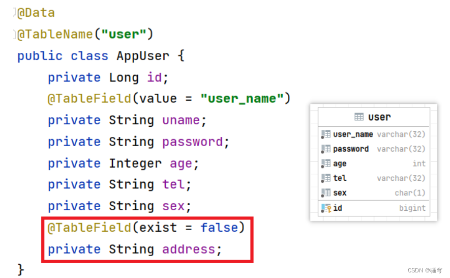 有时候,我们会在JavaBean中添加一些自定义的属性,而这些属性 是没有任何字段与之对应的。MP在操作数据库时,如果有任何属性找不到对应的字段,就会报错“找不到字段”。如下图示例:这时候我们可以通过添加,告诉MP,这个属性没有对应的字段,MP就不会报错了以前使用Mybatis开发时,遇到动态条件的查询,就需要我们在xml文件里使用各种标签实现SQL语句的动态拼接。而MP把这些封装成了Java的A