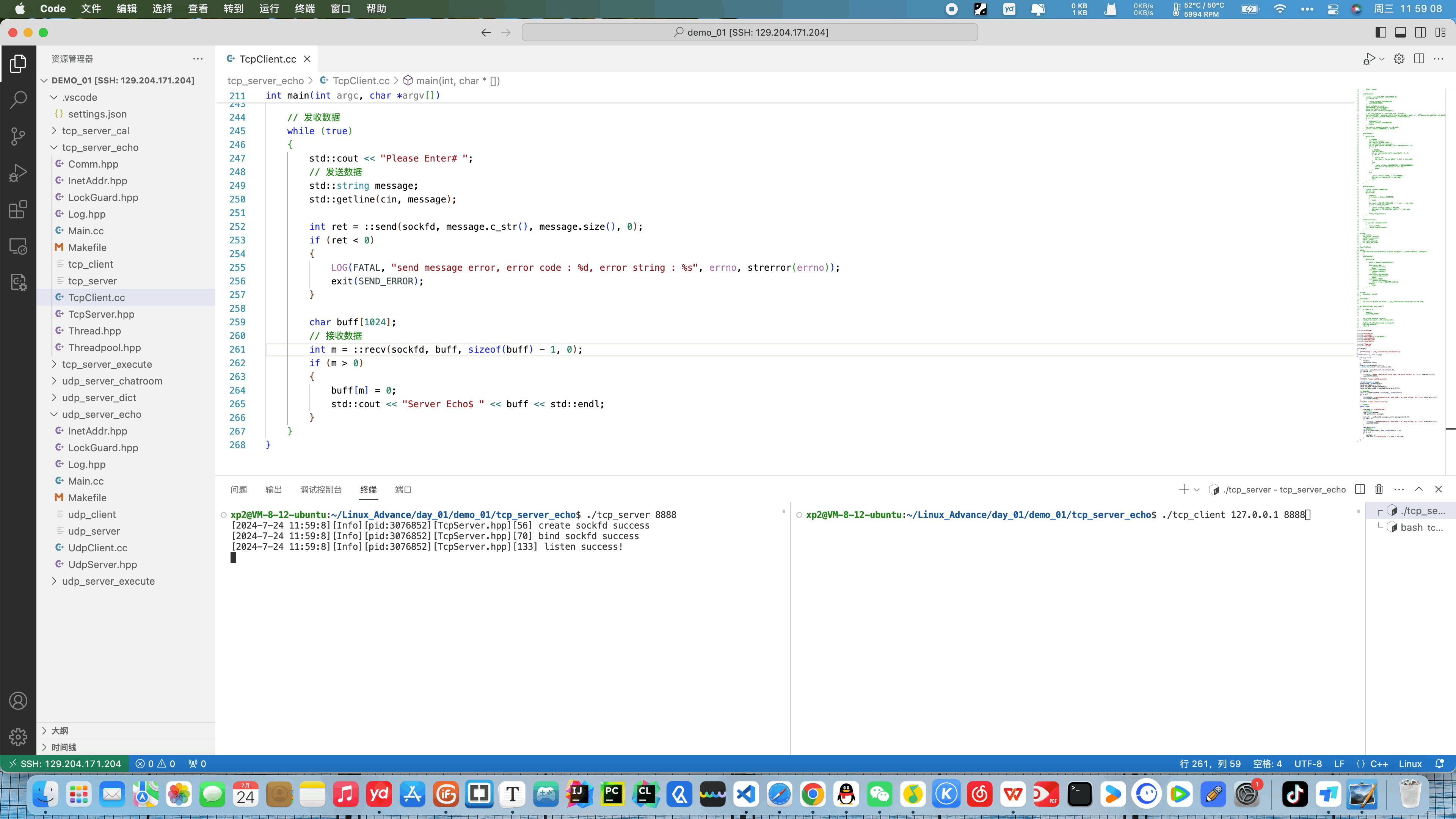 TcpClient.cc文件#include <iostream> #include <strings.h> #include <string.h> #include <sys/types.h> /* See NOTES */ #include <sys/socket.h> #include <netinet/in.h> #include <arpa/inet.h> #include "Comm.hpp" #include "Log.hpp" void Usage() { printf("Usage : ./udp_client serverip serverport\n"); } int main(int argc, char *argv[]) { if (argc != 3) { Usage(); exit(USAGE_ERROR); } std::string serverip = argv[1]; uint16_t serverport = std::stoi(argv[2]); int sockfd = socket(AF_INET, SOCK_STREAM, 0); if (sockfd < 0) { LOG(FATAL, "create sockfd error, error code : %d, error string : %s", errno, strerror(errno)); exit(CREATE_ERROR); } LOG(INFO, "create sockfd success"); struct sockaddr_in local; bzero(&local, sizeof(local)); local.sin_family = AF_INET; local.sin_port = htons(serverport); local.sin_addr.s_addr = inet_addr(serverip.c_str()); // 发起连接 int n = ::connect(sockfd, CONV(&local), sizeof(local)); if (n < 0) { LOG(WARNING, "create connect error, error code : %d, error string : %s", errno, strerror(errno)); exit(CONNECT_ERROR); } LOG(INFO, "create connect success"); // 发收数据 while (true) { std::cout << "Please Enter# "; // 发送数据 std::string message; std::getline(cin, message); int ret = ::send(sockfd, message.c_str(), message.size(), 0); if (ret < 0) { LOG(FATAL, "send message error, error code : %d, error string : %s", errno, strerror(errno)); exit(SEND_ERROR); } char buff[1024]; // 接收数据 int m = ::recv(sockfd, buff, sizeof(buff) - 1, 0); if (m > 0) { buff[m] = 0; std::cout << "Server Echo$ " << buff << std::endl; } } }