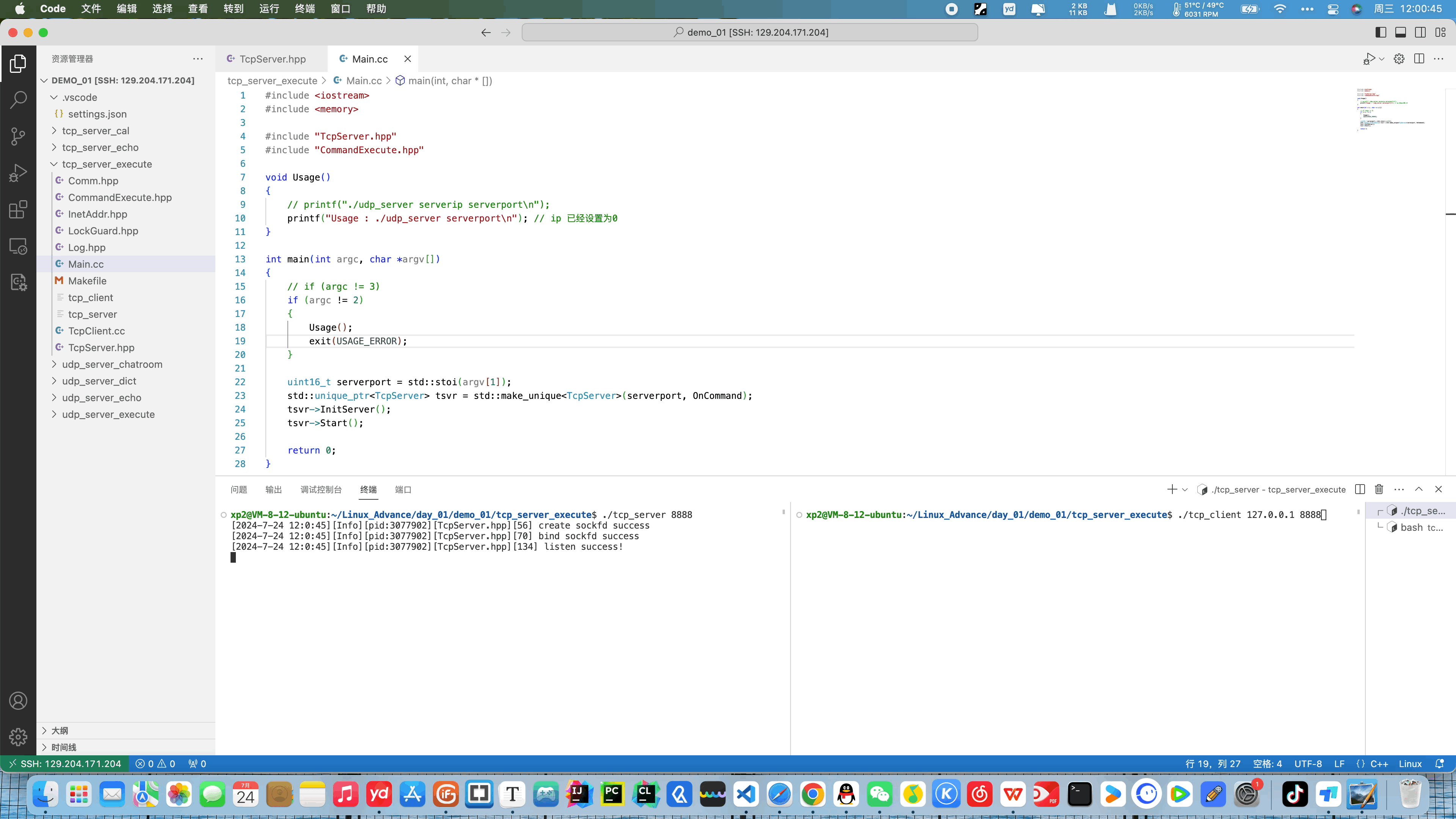 Main.cc文件#include <iostream> #include <memory> #include "TcpServer.hpp" #include "CommandExecute.hpp" void Usage() { // printf("./udp_server serverip serverport\n"); printf("Usage : ./udp_server serverport\n"); // ip 已经设置为0 } int main(int argc, char *argv[]) { // if (argc != 3) if (argc != 2) { Usage(); exit(USAGE_ERROR); } uint16_t serverport = std::stoi(argv[1]); std::unique_ptr<TcpServer> tsvr = std::make_unique<TcpServer>(serverport, OnCommand); tsvr->InitServer(); tsvr->Start(); return 0; }