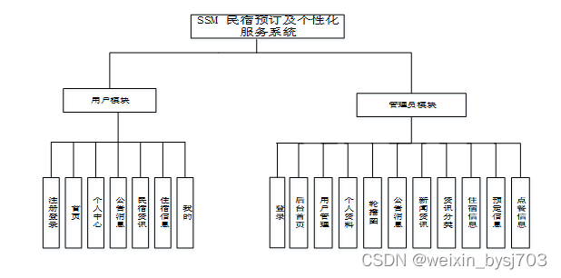 本民宿预订及个性化服务系统主要包括两大功能模块,即管理员功能模块和用户模块。