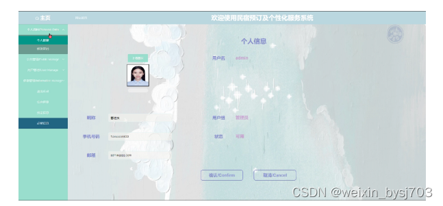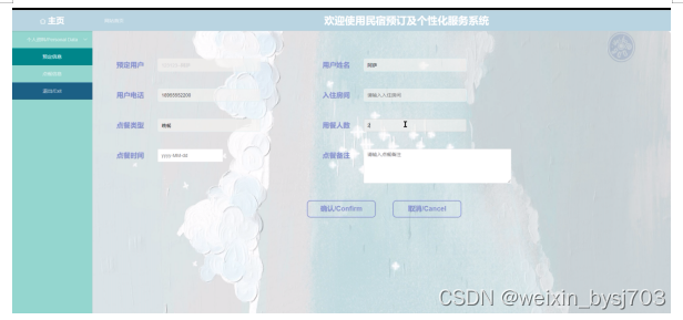 SSM民宿预订及个性化服务系统的主要使用者分为管理员和用户,实现功能包括:首页、用户管理(管理员、普通用户)、公共管理(轮播图、公告消息)信息管理(民宿资讯、资讯分类)住宿信息、预定信息、点餐信息、个人资料(个人信息、修改密码)等功能。由于本网站的功能模块设计比较全面,所以使得整个民宿预订及个性化服务系统的过程得以实现。