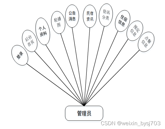 (1)管理员模块:系统中的核心用户是系统管理员,管理员登录后,通过管理员菜单来管理后台系统。主要功能有:首页、用户管理(管理员、普通用户)、公共管理(轮播图、公告消息)信息管理(民宿资讯、资讯分类)住宿信息、预定信息、点餐信息、个人资料(个人信息、修改密码)等功能。管理员用例图如图3-1所示。