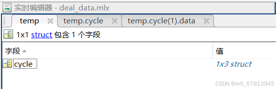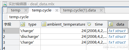 01.第一个组合得到cycle这一个大表格的数据,如果里面还有其他字段也可以直接使用下标或者字段名读取,例如data[filename][0][0]['cycle'] / data[filename][0][0][0] / data[filename][0][0]['XXX'] XXX 表示其他字段值